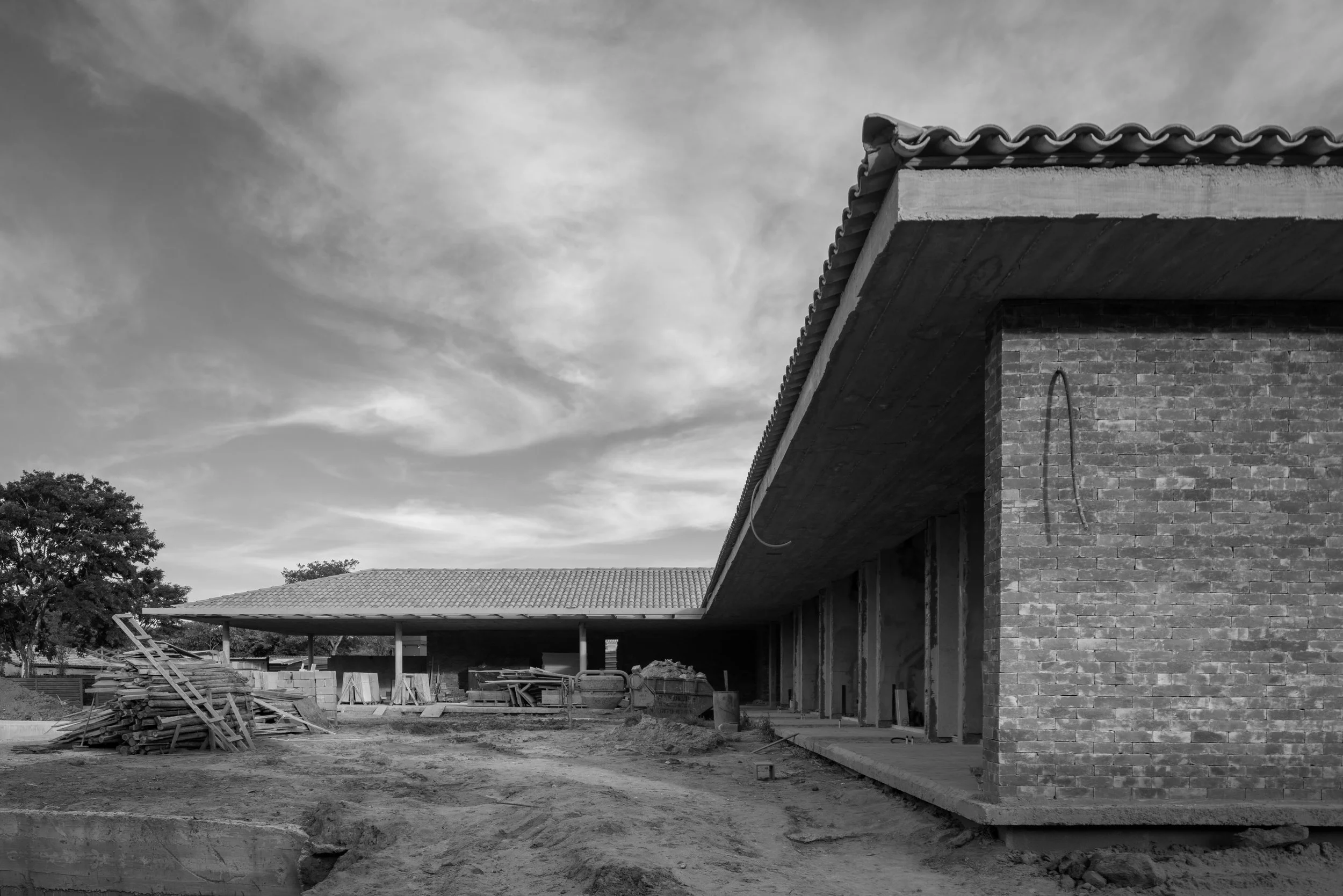 A CASA BETON BUSCA A HORIZONTALIDADE E INTEGRAÇÃO ENTRE OS ESPAÇOS INTERNOS E EXTERNOS. ELEVADA EM UM PLATÔ, SUA IMPLANTAÇÃO EM FORMATO "L" PERMITE UMA ABERTURA TOTAL PARA A ÁREA DE LAZER, PROTEGENDO A PRIVACIDADE DOS MORADORES. O CONTRASTE ENTRE O TIJOLO NA COR TERRA E O CINZA DO CONCRETO ESTABELECE UM DIÁLOGO ENTRE O TRADICIONAL E O CONTEMPORÂNEO, ENQUANTO A PÉRGOLA EM AÇO CORTEN, COM SEUS BRISES MÓVEIS, OFERECE PROTEÇÃO E UM CONVITE ACOLHEDOR. A ARQUITETURA DA CASA BETON É UM EXEMPLO DE COMO MATERIAIS CUIDADOSAMENTE SELECIONADOS PODEM CRIAR UMA HARMONIA VISUAL E FUNCIONAL, DESTACANDO A BELEZA DO ENTORNO NATURAL.