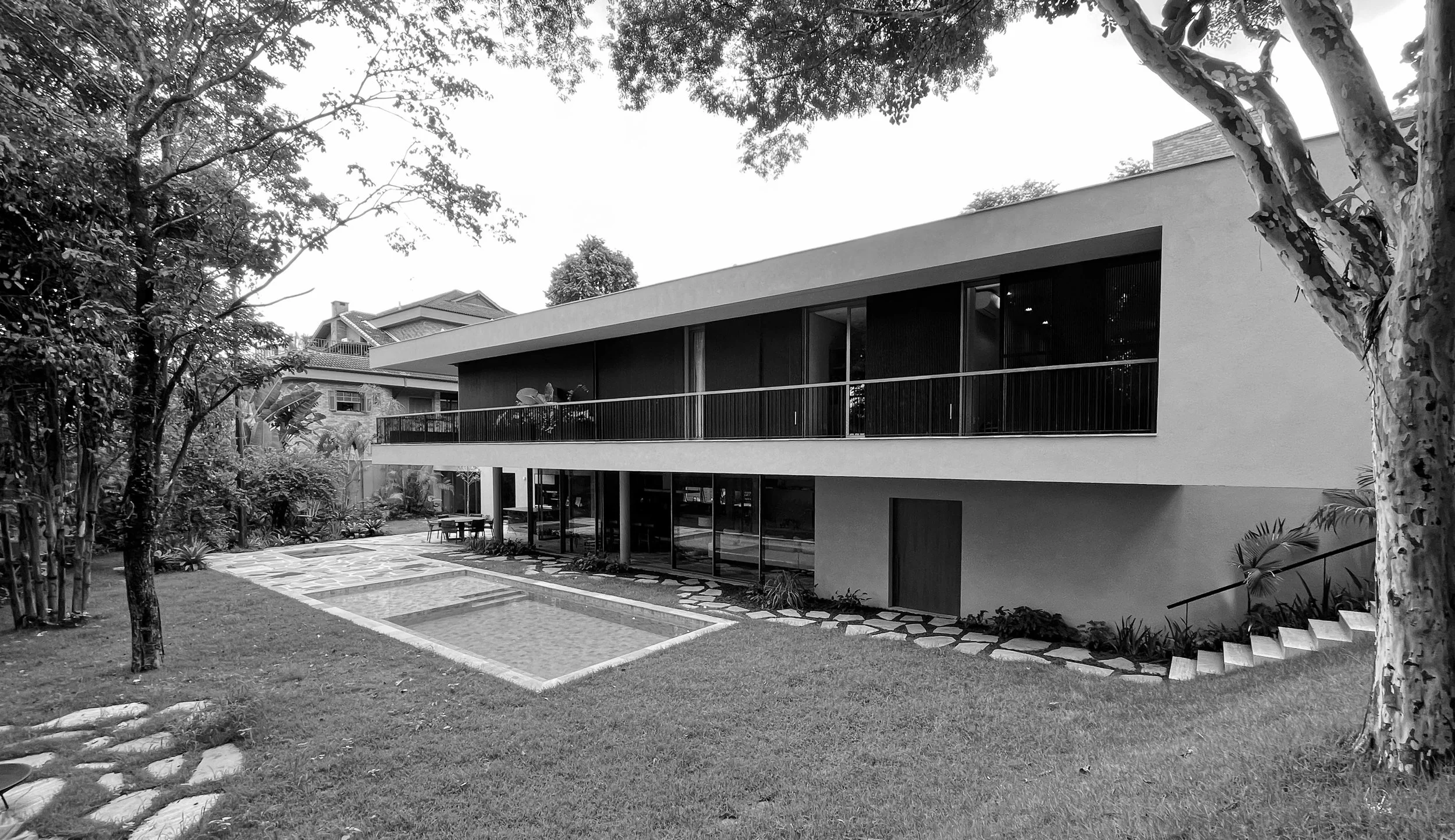A CASA PAU-BRASIL BUSCA A RECONEXÃO COM MEMÓRIAS AFETIVAS E O ENTORNO NATURAL. PROJETADA PARA PRESERVAR AO MÁXIMO A VEGETAÇÃO EXISTENTE, A RESIDÊNCIA SE ERGUE DE FORMA DISCRETA E SUTIL, QUASE SE CAMUFLANDO NO TERRENO QUE A ACOLHE. AS LINHAS SIMPLES E ELEGANTES DA ESTRUTURA CRIAM UMA HARMONIA VISUAL QUE UNE O INTERIOR AO EXTERIOR, ONDE O PAISAGISMO ADENTRA OS ESPAÇOS SOCIAIS, TRANSFORMANDO A CASA EM UMA VERDADEIRA CASA JARDIM. CADA ELEMENTO ARQUITETÔNICO FOI PENSADO PARA CELEBRAR A CONVIVÊNCIA E A CELEBRAÇÃO EM UM AMBIENTE ACOLHEDOR E NATURAL.