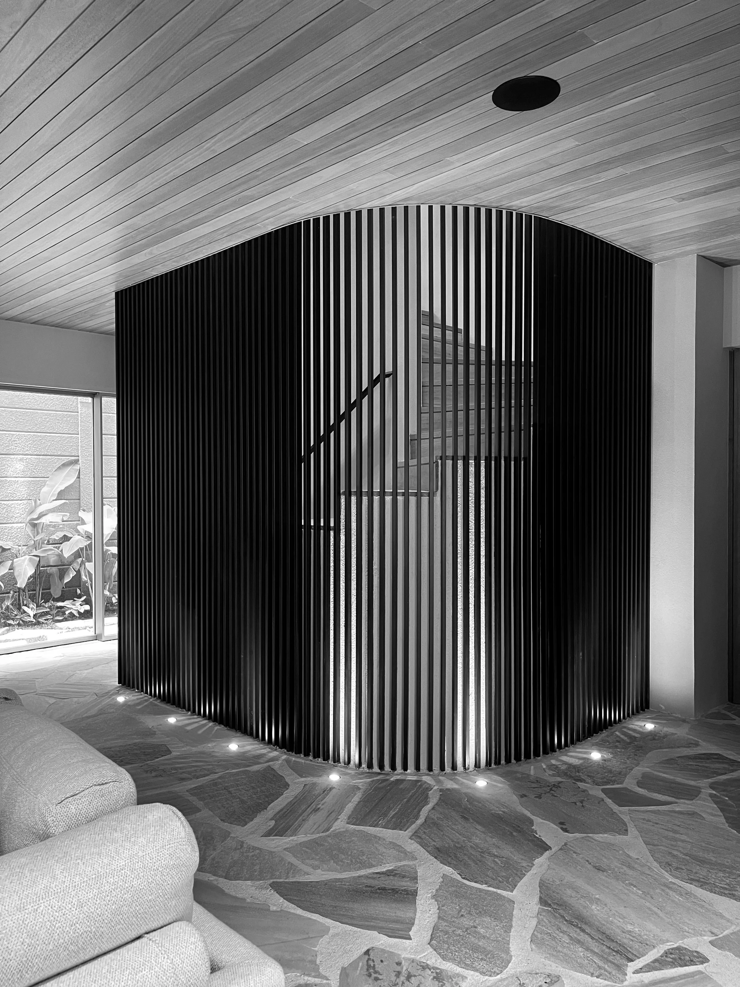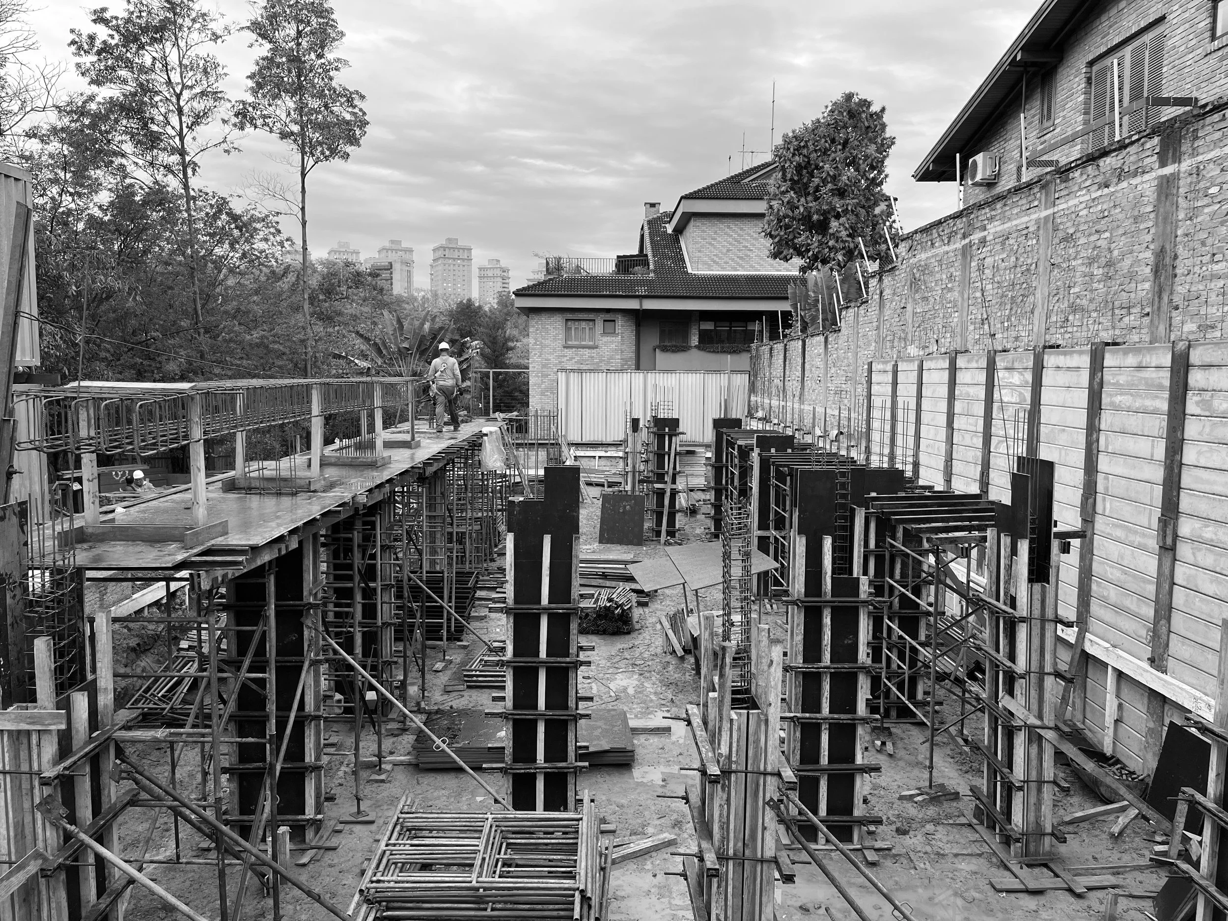 A CASA PAU-BRASIL UTILIZA UM SISTEMA CONSTRUTIVO ROBUSTO E EFICIENTE, COM ESTRUTURA EM CONCRETO ARMADO COMPOSTA POR UMA GRELHA DE VIGAS QUE MINIMIZA O NÚMERO DE APOIOS, RESULTANDO EM AMPLOS VÃOS LIVRES E UM BALANÇO GENEROSO NA COBERTURA DA ÁREA GOURMET. ESTA SOLUÇÃO ESTRUTURAL PERMITE QUE O VOLUME SUPERIOR "POUSE" SUAVEMENTE SOBRE O TÉRREO, CRIANDO UMA SENSAÇÃO DE LEVEZA E ELEGÂNCIA. MATERIAIS SELECIONADOS COM CUIDADO, COMO A TEXTURA EM TONS DE CINZA PARA AS PAREDES, O FORRO EM MADEIRA E O PISO EM CACÕES DE PEDRA SÃO TOMÉ, CONTRIBUEM PARA O CONFORTO E ESTÉTICA. A FACHADA SUPERIOR, REVESTIDA COM PAINEL RIPADO DE ALUMÍNIO, GARANTE SEGURANÇA E PRIVACIDADE, ALÉM DE PROPORCIONAR UNIFORMIDADE VISUAL.